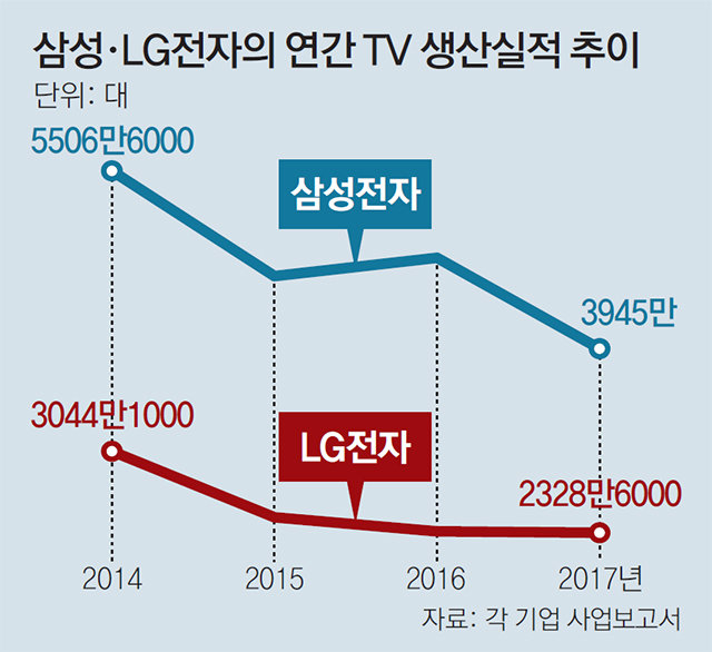 삼성전자의 2017년 사업보고서에 따르면 삼성전자의 TV 생산실적은 2016년 4742만8000대에서 지난해 3945만 대로 1년 만에 약 800만 대가 감소했다. 2011년 생산실적이 4859만 대에서 2012년 5337만5000대로 증가한 뒤 꾸준히 5000만 대 선을 지켰지만 2015년부터 하락세가 시작됐다. LG전자는 2016년 생산실적 2340만100대에서 지난해 2328만6000대로 약 12만 대 감소했다. 감소량은 삼성전자에 비해 미미하지만 2014년 이후 3년 연속 하락세다.