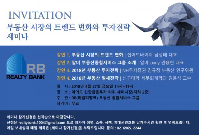 알비(리얼티뱅크) 부동산 종합서비스그룹은 오는 27일 서울 여의도에서 ‘부동산시장의 트렌드 변화와 투자전략’ 세미나를 개최한다고 11일 밝혔다.