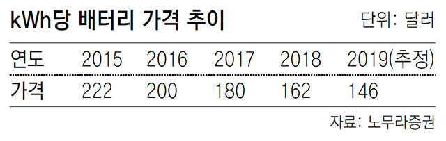 LG화학은 배터리 사업 수익성 개선도 기대할 수 있게 됐다. 전기차 기업은 한정돼 있지만 배터리 업체들의 경쟁이 치열해지면서 배터리 가격이 점차 낮아지는 추세이기 때문이다. 노무라증권에 따르면 배터리 가격은 2015년 kWh당 222달러에서 2018년 162달러로 떨어지고, 2023년에는 100달러 선이 무너질 것으로 예상했다. 화학업계 관계자는 “원재료 가격 폭등으로 인한 원가 상승분을 완성차 업체들이 제품 가격에 반영해주는 것에 한계가 있기 때문에 사실상 원재료 가격 상승 부담은 배터리 업체들이 떠안아야 했다”며 “LG화학은 합작법인에서 생산되는 제품을 우선 공급받아 원가 부담을 덜게 됐다”고 설명했다.