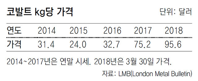 배터리를 미래 성장동력으로 정하고 공격적인 수주를 벌이고 있는 LG화학에 코발트의 안정적인 수급은 가장 큰 숙제였다. 세계 코발트 생산량 60%를 차지하는 콩고의 내정 불안, 주요 코발트 생산 업체인 글렌코어의 노후 광산 가동 중단 등으로 코발트 가격이 폭등하고 있기 때문이다. 코발트 가격은 2016년 말 kg당 32.7달러에서 지난달 말 기준 95.6달러까지 올랐다. 이 때문에 LG화학뿐만 아니라 SK이노베이션, 삼성SDI 등 배터리 업체들은 코발트 확보 및 코발트가 필요 없는 배터리 기술 개발 등 자구책 마련에 나서 왔다.