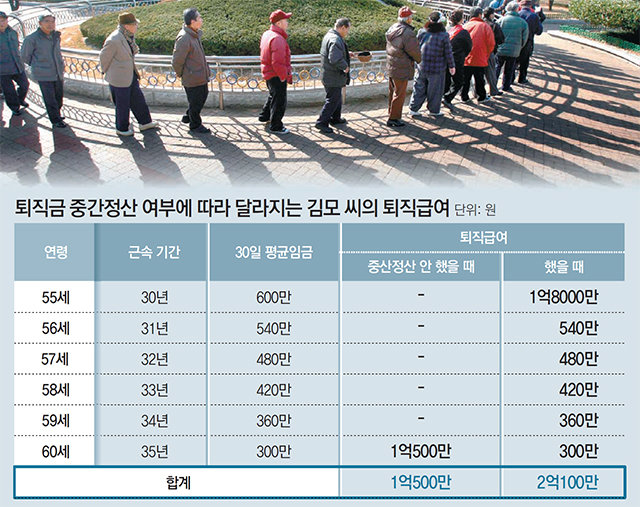 퇴직급여를 손해 보지 않으려면 퇴직금을 중간정산 해야 한다. 김 씨가 55세 임금피크 때 중간정산을 하면 퇴직급여로 1억8000만 원을 받는다. 그리고 이듬해부터 퇴직할 때까지 매년 중간정산을 하면 30일분 평균임금에 해당하는 돈을 퇴직급여로 받을 수 있다. 이렇게 55세부터 6회에 걸쳐 정산한 퇴직급여를 전부 합치면 2억100만 원이 된다.