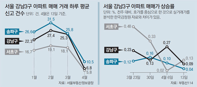 강남구 4월 하루 평균 6.8건 거래… 서초-송파도 작년 거래량의 반토막