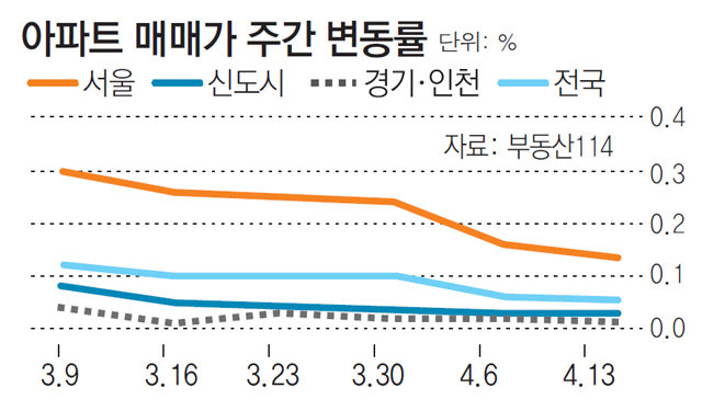 15일 부동산114에 따르면 지난주 서울 아파트값 상승률은 0.13%로 전주(0.16%)보다 0.03%포인트 감소했다. 2월 둘째 주(0.57%)부터 9주째 감소세다. 지역별로는 금천(―0.11%) 도봉 강북(이상 보합) 송파 동작구(이상 0.04%) 등이 서울 평균을 밑돌았다. 반면 성북(0.44%) 중(0.37%) 마포구(0.28%) 등은 도심 접근성이 좋은 단지들을 중심으로 비교적 높은 상승률을 보였다.