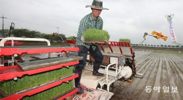 23일 부산 강서구 죽동동 논에서 김경량 씨가 부산 지역 첫 모내기를 하고 있다. 김 씨는 5950m² 논에 운광벼 품종을 심어 추석 전인 8월 하순경에 수확할 예정이다.