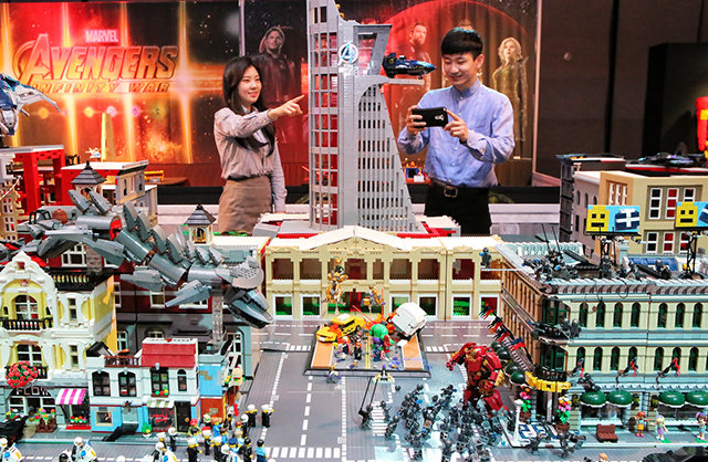 현대백화점은 7일까지 서울 강동구 천호점 13층 문화홀에서 ‘마블 어벤저스 브릭 전시회’를 연다고 2일 밝혔다. 마블 스튜디오의 어벤저스 시리즈 영화 장면을 연출한 축소 모형 등 40여 개 작품을 볼 수 있다. 전시장을 찾은 고객들이 사진 촬영을 하며 즐거운 시간을 보내고 있다.