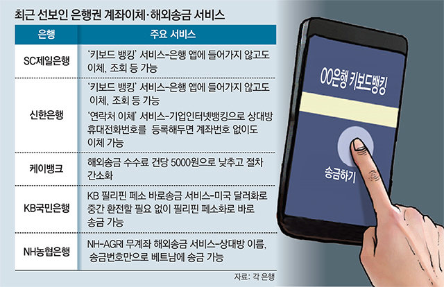 7일 은행권에 따르면 SC제일은행과 신한은행은 ‘키보드뱅킹’ 서비스를 잇달아 선보였다. 은행 앱에 들어가지 않고도 스마트폰을 이용해 자금 이체와 계좌 조회 등을 할 수 있는 서비스다. 스마트폰 메신저로 대화를 하거나 인터넷 쇼핑을 하다가 손쉽고 빠르게 돈을 보낼 수 있는 게 장점이다. 기존에는 은행 앱을 켠 뒤 공인인증서 비밀번호와 상대방 계좌번호를 입력하고 비밀번호를 다시 한 번 눌러야 하는 번거로움이 있었다.
