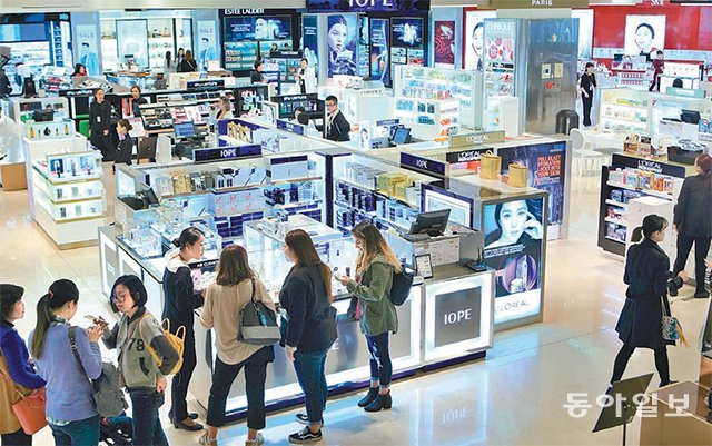 면세점제도 개선 태스크포스가 현재 5년으로 제한된 대기업에 대한 면세점 특허기간을 최장 10년으로 늘리는 권고안을 내놨다. 서울 시내 한 면세점 화정품코너에서 관광객들이 쇼핑하고 있다. 동아일보DB