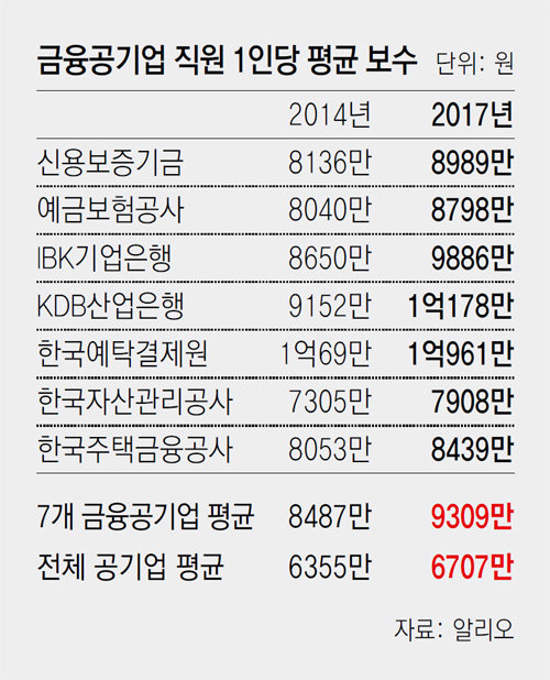 28일 공공기관 경영정보공개시스템 ‘알리오’에 따르면 금융위 산하 7개 공공기관(신용보증기금 예금보험공사 IBK기업은행 KDB산업은행 한국예탁결제원 한국자산관리공사 한국주택금융공사)의 지난해 직원 1인당 평균 보수는 9309만 원으로 집계됐다. 이는 361개 전체 공공기관의 평균 보수(6707만 원)보다 38.8% 많은 규모다.