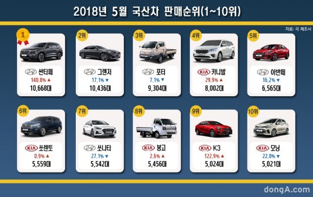 현대차 싼타페 베스트셀링 모델은 현대차 싼타페가 차지했다. 1만668대(구형 296대 포함)가 팔려 3개월 연속 1만대 넘는 판매고를 올렸다. 구형이 판매되던 작년보단 140.8% 증가한 실적이다. 올해 1~5월 누적 판매대수는 4만2679대(구형 8045대 포함)로 그랜저에 이어 2위를 기록 중이다. 그랜저는 1만436대로 2위에 올랐다. 내연기관 모델 판매가 소폭 줄었지만 하이브리드 버전이 2521대나 팔려 실적을 끌어올렸다. 올해 누적 판매량은 4만9523대(하이브리드 9758대 포함)로 1위를 달리고 있다.