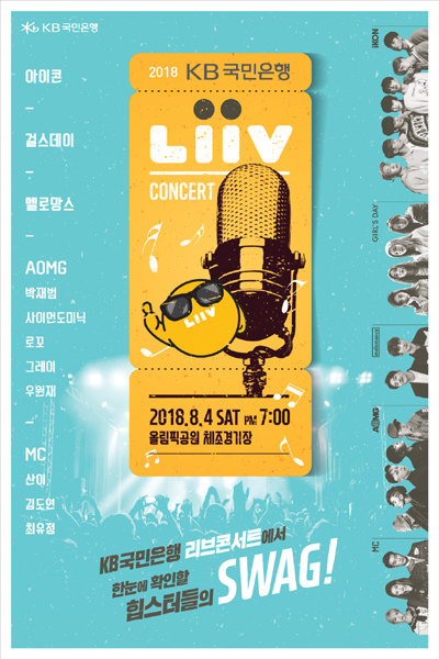 KB국민은행이 8월4일 서울 올림픽공원 체조경기장에서 ‘2018 Liiv(리브) 콘서트’를 연다. 아이콘, 걸스데이, 멜로망스, 박재범, 사이먼 도미닉, 우원재가 출연해 K팝과 힙합이 어우러진 공연을 선보일 예정이다. 주요 스마트 상품 및 젊은층 브랜드 이용 고객 1만명을 초청할 예정이다. 티켓은 총 5개로 마련한 이벤트를 통해 받을 수 있다.