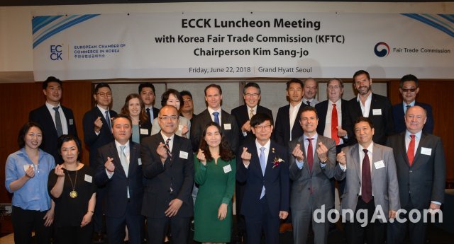 주한유럽상공회의소(ECCK)는 22일 그랜드 하얏트 서울에서 김상조 위원장 초청 오찬 간담회를 열었다. 행사에는 김 위원장과 디미트리스 실라키스 ECCK 회장 겸 벤츠코리아 사장을 비롯해 ECCK 소속 회원기업과 유럽국 대사관 관계자 등 50여명이 참석했다.