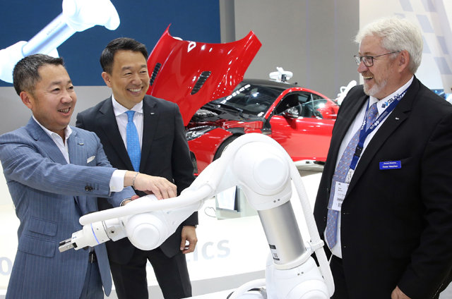이번 전시회에서 두산로보틱스는 자체 개발한 협동로봇 작업을 직접 시현해 눈길을 끌었다. 빨간색 고급 자동차를 사람(작업자)과 협동로봇 6대가 함께 조립하는 모습을 직접 공개한 것이다. 협동로봇은 로봇과 사람이 함께 일하는 공정을 위한 기계다. 두산로보틱스는 이날 협동로봇이 스스로 필요한 부품을 찾아낸 뒤 작업자에게 직접 집어 전달하는 등의 협업 장면을 연출했다.