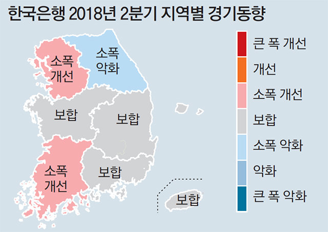 올 2분기(4∼6월) 수도권과 호남을 제외한 전 지역의 경기 회복세가 1분기(1∼3월)보다 둔화된 것으로 나타났다. 반도체 호조로 수도권 경기는 개선됐지만 강원권은 평창 겨울올림픽 종료로 기저효과가 나타나면서 경기가 악화됐다.