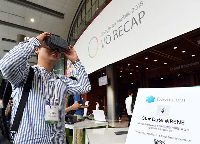 구글코리아가 주최하는 ‘구글 AI(인공지능) 위크 2018’이 25일부터 나흘간 진행된다. 첫째 날인 25일 ‘구글 포 모바일 I/O 리캡 2018’ 행사가 서울 강남구 코엑스 콘퍼런스센터에서 열렸다. 이날 행사에서는 가을에 출시될 모바일 운영체제 안드로이드 P와 AI를 적용한 구글의 여러 제품이 소개됐다. 행사장에서 참석자가 구글의 가상현실(VR) 플랫폼 ‘데이드림’을 체험하고 있다.