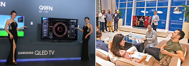 삼성전자가 동남아와 중동 등 신흥시장에서 프리미엄 TV 매출을 끌어올리는 데 공을 들이고 있다. 왼쪽 사진은 지난달 베트남 호찌민에서 열린 QLED TV 출시 행사에서 모델들이 QLED TV를 소개하는 모습. 오른쪽 사진은 지난달 아랍에미리트 두바이 고급 호텔 펜트하우스에서 열린 QLED TV 출시 행사장 풍경. 삼성전자 제공