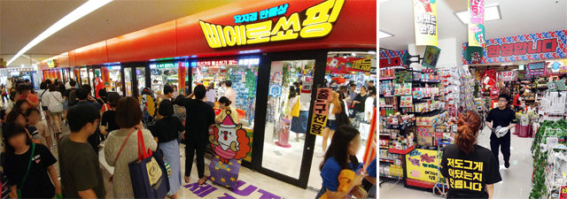 삐에로쑈핑에는 다양한 ‘유머 코드’도 녹아 있다. 이름부터 외래어 표기 원칙에서 벗어난 ‘삐에로(피에로)’ ‘쑈핑(쇼핑)’을 썼다. B급 감성을 보여주려는 의도가 엿보이는 대목이다. 매장 입구 바닥에도 ‘제정신일 의무 없음’이라는 문구가 있다. 이것저것 생각하지 말고 쇼핑에 열중하라는 노골적인 표현이다. 종업원이 입고 있는 티셔츠에도 ‘저도 그게 어딨는지 모릅니다’라는 문구가 쓰여 있다. 고객들이 보물찾기를 하듯 쇼핑하라는 메시지이다. 단순한 유니폼을 입고 고객들을 응대하는 돈키호테 종업원들과는 다른 모습이다.