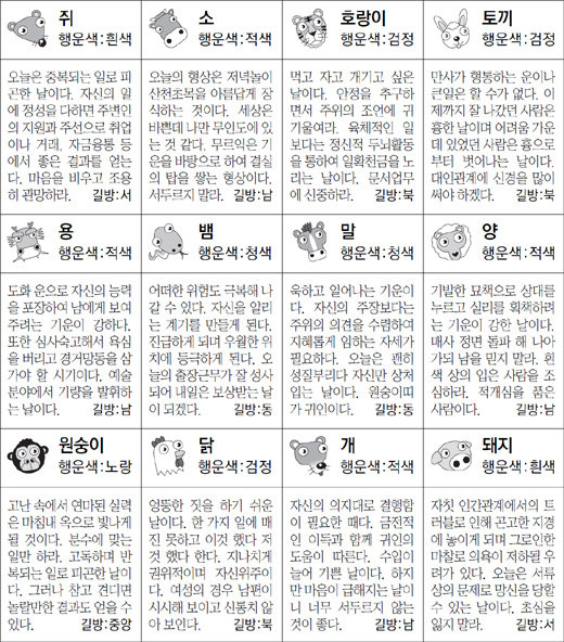 ▲ 오늘의 운세 도표. 스포츠동아