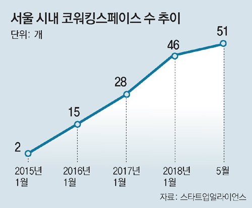 24일 스타트업 창업을 지원하는 스타트업얼라이언스가 내놓은 ‘코워킹스페이스 트렌드 리포트’에 따르면 위워크와 패스트파이브 등 서울 시내 공유 오피스는 5월 말 현재 51개로 2015년 1월(2개)보다 25배 이상으로 늘었다.