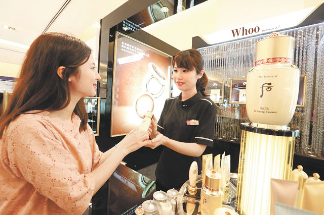 대만 타이베이의 한 대형 백화점에 있는 LG생활건강 화장품 브랜드 ‘후’ 매장에서 현지 고객이 제품을 고르고 있다. LG생활건강은 중화권 시장에서 철저한 고급화 전략을 고수하며 사상 최대 실적을 거두고 있다. LG생활건강 제공