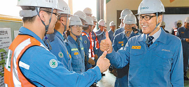 최정우 신임 포스코 회장(오른쪽)은 27일 취임식을 끝내자마자 경북 포항 포항제철소 제2고로 현장을 방문했다. 최 회장은 이날 기자간담회에서 비(非)철강 비엔지니어 출신이라는 평가에 대해 “철강 전문가는 이공계 전문가겠지만 경영전략을 짜온 나는 철강업 전문가”라며 자신감을 드러냈다. 포스코 제공