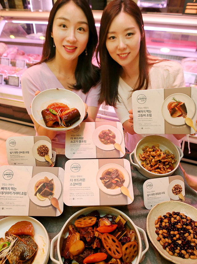 23일 서울 강남구 현대백화점 압구정본점에서 모델들이 가정간편식(HMR) ‘그리팅 소프트’를 선보이고 있다. 그리팅 소프트는 씹고 삼키기 편한 ‘연화식’으로 만들어진 첫 HMR이다. 현대백화점그룹 계열 종합식품기업 현대그린푸드는 그리팅 소프트 12종을 24일부터 판매한다.