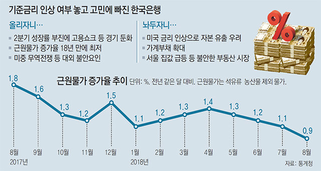 지난해부터 기준금리 인상 깜빡이를 켜왔던 한국은행의 금리정책이 갈수록 꼬여가고 있다. 미국과의 금리 격차를 생각하면 이미 금리를 올렸어야 했지만 투자, 소비, 고용이 한꺼번에 비틀거리는 경제 상황 때문에 인상 시점을 잡기 어려워진 것. 여기에 물가마저 생각만큼 오르지 않으면서 금리 인상의 명분이 약해지고 있다. 이 때문에 연내에 금리를 올리기 힘들 것이라는 의견까지 솔솔 나오고 있다.