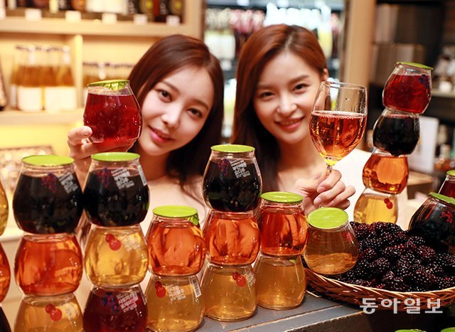 5일 서울 중구 신세계백화점 본점 전통주 매장 ‘우리 술방’에서 모델들이 한 컵 분량(187mL)의 전통주를 선보이고 있다. 이 전통주는 고랭지 사과 맛이 나는 ‘산내울 사과주’와 국내산 오미자를 숙성시킨 ‘산내울 오미자주’ 등 5종이다.
