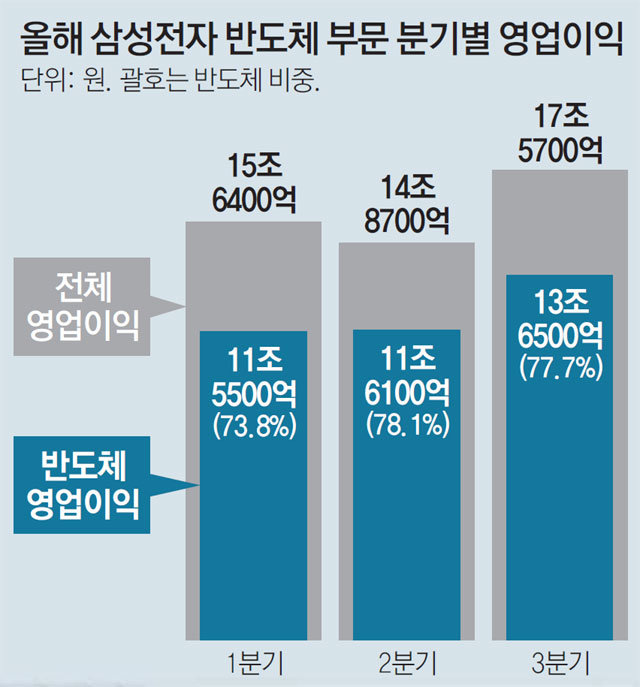 업계에서는 삼성전자의 반도체 사업 의존도에 대한 우려가 적지 않다. 지난해 연간 영업이익에서 반도체 영업이익이 차지한 비중은 65.6%였지만 지난해 4분기를 기점으로 70%대를 넘어 ‘반도체 편중’이 심화되고 있다. 반도체 가격이 꺾이면 삼성전자 실적이 휘청거릴 수도 있다. 시장조사업체 ‘D램 익스체인지’는 4분기 D램 가격(고정거래가격)이 3분기 대비 5% 이상 하락하고 낸드플래시 가격은 10∼15% 떨어질 것이라고 전망했다.