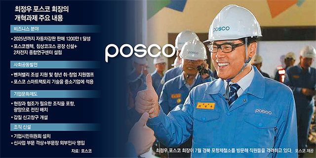5일로 취임 100일을 맞은 최정우 포스코 회장이 ‘포스코 개혁’ 청사진을 공개했다. 미래 먹거리로 겨냥한 배터리(2차전지) 사업은 철강과 동급으로 격상시켜 키운다. 그룹 내 중복된 사업은 한 곳으로 모아 효율성을 높이고, 기업의 사회적 책무를 전담하는 조직을 신설하기로 했다.