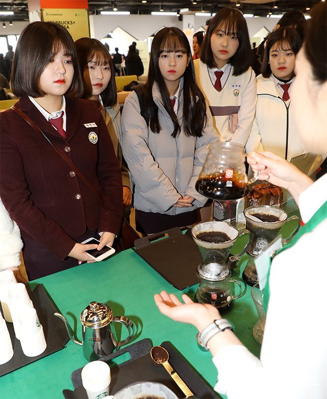 스타벅스커피코리아는 5일 서울 용산구 Y밸리에서 특성화고 학생 350여 명을 초청해 바리스타 체험 등 진로교육과 취업을 연계하는 잡페어를 열었다. 국제 비정부기구(NGO) ‘주니어 어치브먼트(JA)’와 함께 마련한 행사다.