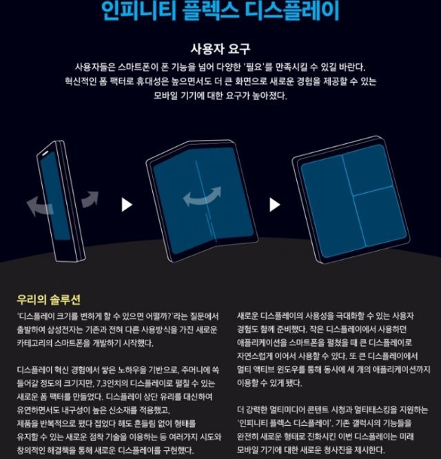 여기에서 한 발 더 나아가, 삼성전자는 최근 ‘인피니티 플렉스 디스플레이’를 선보였다. 삼성전자 측은 “기존과 전혀 다른 사용방식을 가진 새로운 카테고리의 스마트폰을 개발하기 시작했다”며 “기존 갤럭시의 기능들을 완전히 새로운 형태로 진화시킨 이번 디스플레이는 미래 모바일 기기에 대한 새로운 청사진을 제시한다”고 설명했다.