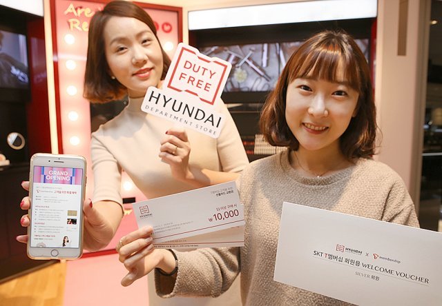 현대백화점면세점은 SK텔레콤 T멤버십 회원이 무역센터점에서 오프라인 멤버십에 신규로 가입하면 금액 할인권, 선불카드 교환권 등 등급별로 다양한 혜택을 준다. VIP와 골드 등급 회원에게는 선불카드 교환권 1만 원권(1달러 이상 구매시)·금액대별 구매할인권(100달러/200달러/300달러 이상 구매시 1만5000원/2만5000원/3만5000원 증정)·커피 기프티콘 쿠폰 등으로 구성된 ‘웰컴바우처’를 증정한다. 실버 등급 회원에게는 선불카드 교환권 1만 원권(1달러 이상 구매시)과 커피 기프티콘을 제공한다.