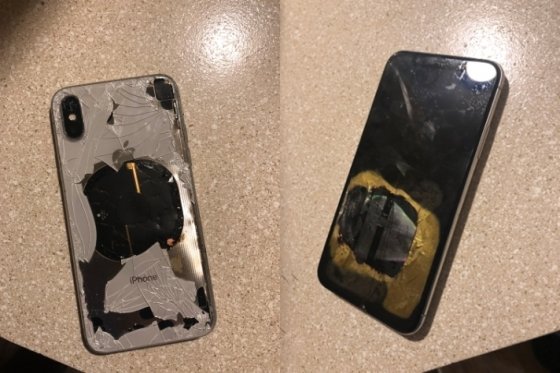 그가 올린 사진 속 폭발한 아이폰X 앞·뒤에는 커다란 구멍이 뚫려 있어 폭발 위력을 그대로 전달한다. 다행히 인명피해는 없는 것으로 알려졌다.