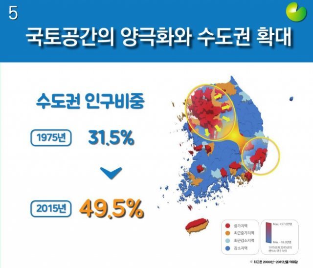 21일 국토연구원의 ‘인구 및 국토 공간구조 변환 전망과 대응방향’에 따르면, 우리나라는 최근 40년(1975~2015년)간 국토 공간상 인구 불균형이 진행중이다.