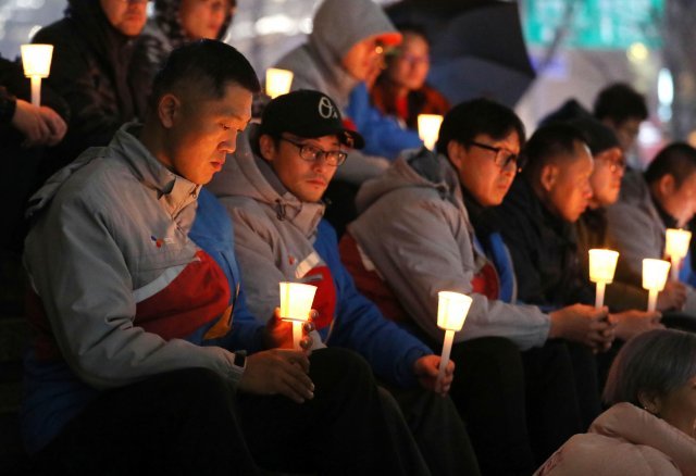 택배연대노조원들이 3일 저녁 서울 중구 파이낸스빌딩 앞에서 안전한 택배를 위한 촛불문화제를 하고 있다.2018.12.3/뉴스1 © News1