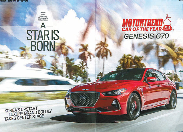 “스타가 탄생했다” 미국 자동차 전문 매체 모터트렌드의 2019년 1월호 커버스토리. 현대자동차 제네시스 G70이 ‘2019 올해의 차’로 소개된 가운데 왼쪽에 ‘스타가 탄생했다’는 제목이 눈길을 끈다. 모터트렌드 제공