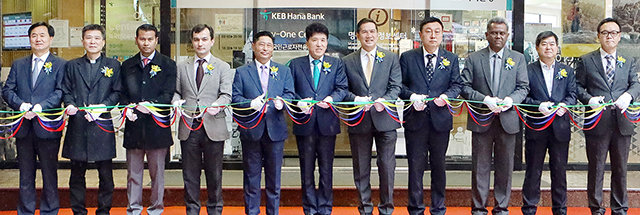 KEB하나은행이 5일 서울 중구 명동사옥 별관 1층에 ‘외국인근로자 전용 센터’를 열었다. 하나은행은 같은 건물에 있는 ‘명동관광정보센터’와 함께 명동을 찾는 외국인 근로자들에게 관광정보와 환전 및 외환송금 등 금융 서비스를 제공할 방침이다. 내년 1월부터는 외국인 근로자를 위한 양방향 번역 단말기를 영업점에 순차적으로 배치할 계획이다. 이날 센터 개설 기념식에 함영주 하나은행장, 라울 에르난데스 주한 필리핀대사, 이재성 서울관광재단 대표이사(왼쪽에서 여섯 번째부터) 등이 참석했다.