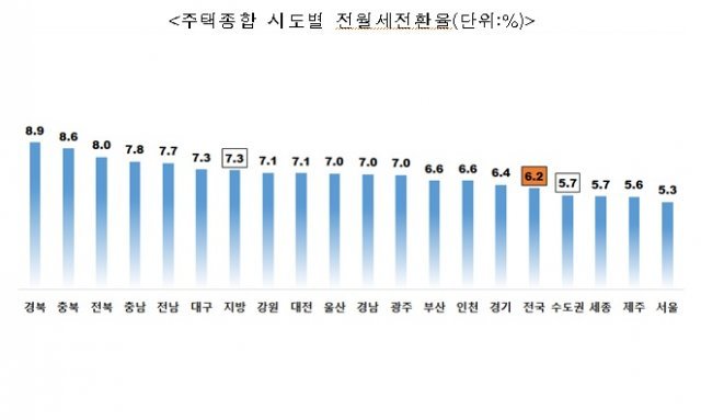 지역별로는 서울이 전월대비 0.1%포인트 떨어진 5.3%를 기록해 전국에서 가장 낮았다. 서울의 전월세전환율은 관련 통계 작성을 시작한 이래 역대 최저치인 지난해 11월 수준으로 되돌아갔다.수도권도 전월 대비 0.1%포인트 내린 5.7%로 집계됐다.