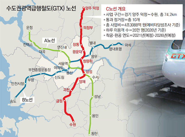 GTX C노선은 경기 양주시 덕정동을 출발해 의정부, 청량리, 삼성, 양재 등을 거쳐 경기 수원시까지 가는 급행철도 노선이다. 역 정차시간을 포함한 열차의 평균속도가 기존 지하철(시속 30km)보다 3배 이상 빠른 시속 100km에 이른다. 최고 시속은 200km다. 완공되면 현재 지하철로 74분 걸리는 의정부∼삼성 구간을 16분, 78분 걸리는 수원∼삼성 구간을 22분 만에 주파할 수 있다.