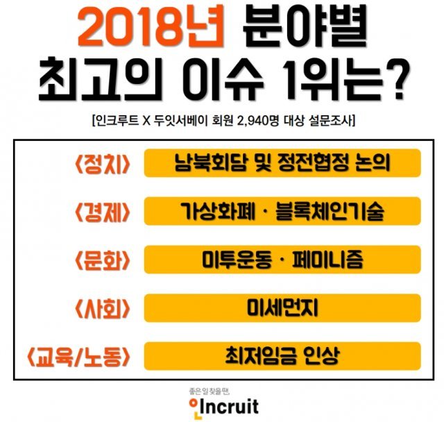 취업포털 인크루트와 설문조사플랫폼 두잇서베이가 성인 2940명을 대상으로 ‘2018 올해의 이슈’에 대해 정치, 경제, 문화, 사회, 교육ㆍ노동 5개 분야에 대해 공동으로 설문조사를 진행했다. 설문은 포털사이트 및 SNS에서 높은 검색빈도를 각 6개 이슈를 엄선, 종합 및 분야별 이슈를 각 1개씩 선택하게 했다.
