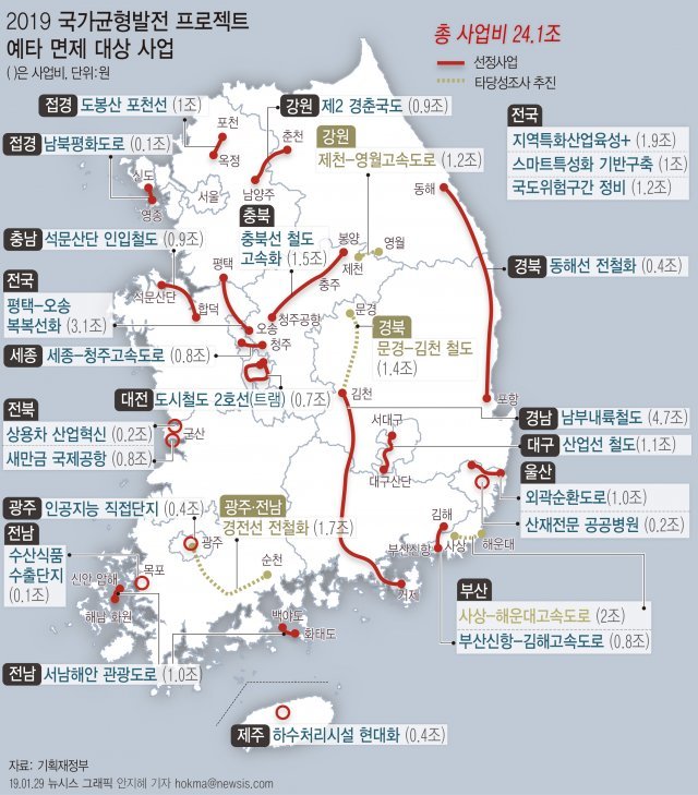 이번 예타면제 대상으로 경북 김천~경남 거제를 잇는 172㎞ 길이의 고속간선철도(4조7000억원), 새만금국제공항 건설(8000억원) 등 굵직한 SOC사업의 추진 속도가 빨라지고 이번에 대상에선 빠졌지만 수도권광역급행철도(GTX)-B노선(5조9000억원)도 3기 신도시사업과 관련해 여전히 유효하다.