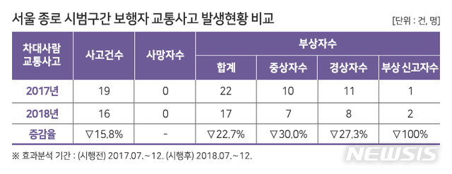 그 결과 지난해 하반기 보행자 교통사고 건수는 16건으로 지난해 같은기간의 19건보다 15.8% 감소했다. 보행 부상자수는 22명에서 17명으로 22.7% 줄었다. 이는 시범사업 실시 이전 5년간 보행자 교통사고 감소율은 2.5%, 부상자수는 등락을 반복하며 큰 변화를 보이지 않았던 것과 비교하면 의미 있는 수치다.