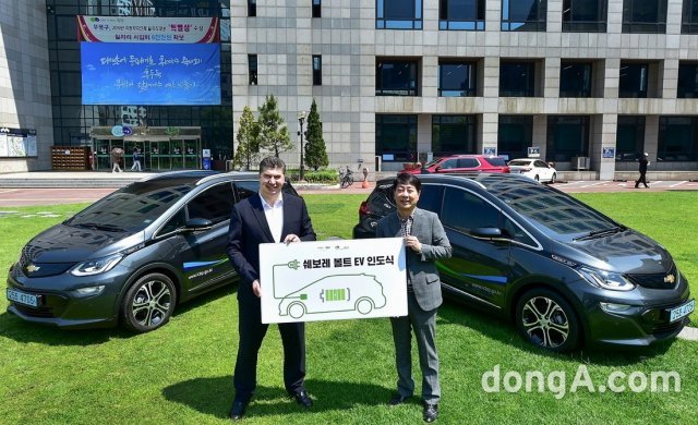 한국GM은 14일 인천시 부평구청에서 볼트EV 차량 인도식을 가졌다. 부평구청은 작년에 이어 올해 업무용차로 볼트 EV 3대를 추가 구매했다. 행사에는 카허 카젬 한국GM 사장을 비롯해 차준택 부평구청장 등 관계자들이 참석했다.