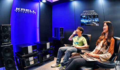 지난 12일 기아차 K7 프리미어 발표회장에 별도로 마련된 청음 부스에서 관람객들이 크렐의 강렬한 사운드를 체험하고 있다. 사진제공|현대모비스