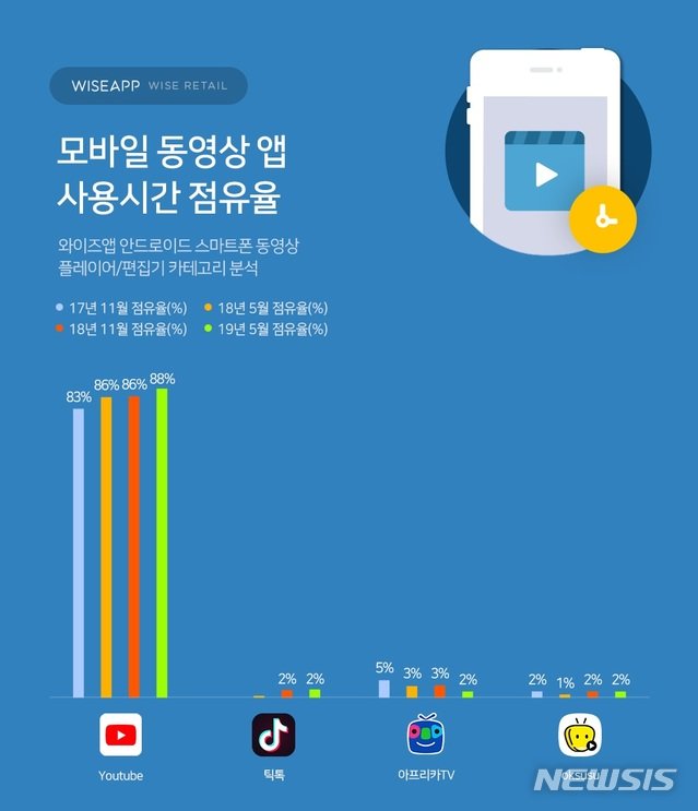 이는 구글 플레이의 ‘동영상 플레이어·편집기’로 등록된 모든 앱의 총 사용시간인 468분의 88%에 달하는 수준이다.지난해 5월 유튜브는 월 사용시간 291억분으로 동영상 카테고리 사용시간의 341억분의 86%를 점유했으나 올해 5월에는 88%로 1년간 점유율이 2%포인트 증가했다.