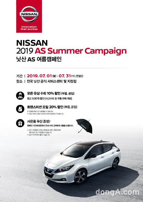 한국닛산이 7월 한 달간 기존 고객 대상 애프터서비스 혜택을 제공하는 ‘2019 AS 썸머 캠페인’을 실시한다고 4일 밝혔다.