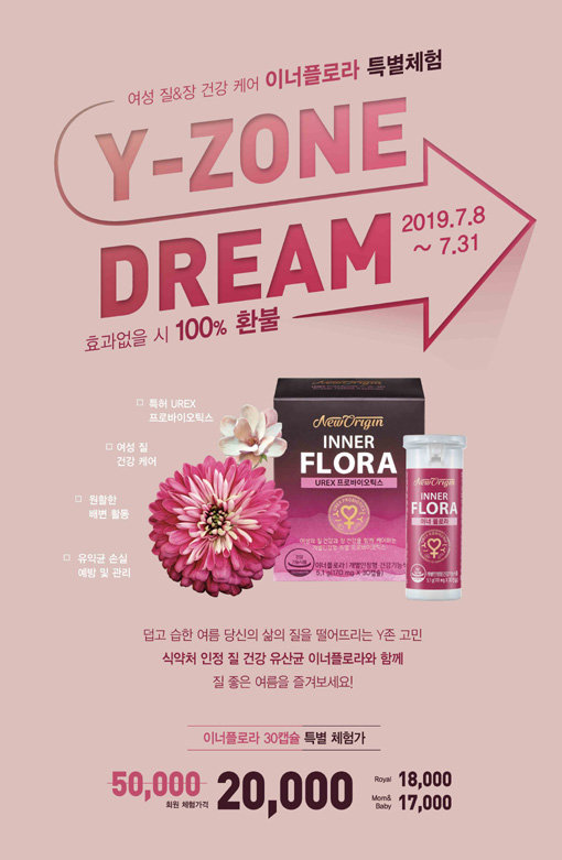 유한양행의 프리미엄 브랜드 뉴오리진은 여성의 질과 장 건강에 도움을 주는 듀얼 프로바이오틱스 ‘이너플로라’ 제품을 구매한 고객을 대상으로 ‘Y-ZONE DREAM 프로모션’을 31일까지 진행한다. 이너플로라(30일분, 5만 원)를 뉴오리진 온라인몰과 매장을 통해 특별 체험가(2만 원)로 만나볼 수 있으며, 섭취 후 불만족 시 100% 환불을 보장한다.
