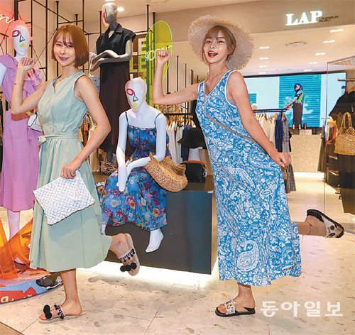 9일 서울 신세계백화점 강남점 여성 캐주얼 브랜드 LAP 매장에서 모델들이 피서지에 어울리는 ‘바캉스룩’을 선보이고 있다. 이 백화점은 14일까지 맥시 원피스를 800개 한정 4만9000원, 라탄백은 150개 한정 5만9000원에 판다.