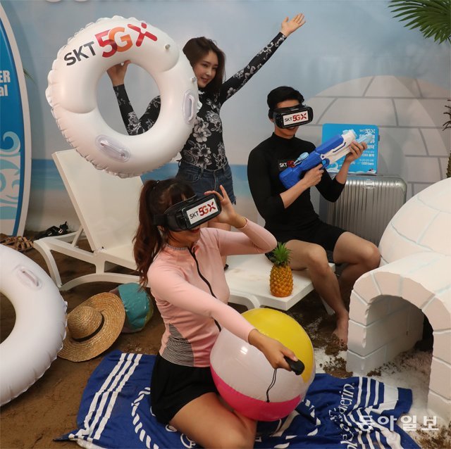 24일 서울 중구 을지로 SK텔레콤 ‘T타워’에 마련된 테마비치에서 모델들이 가상현실(VR) 기기를 착용한 채 콘텐츠를 감상하고 있다. 이날 SK텔레콤은 30일부터 다음 달 15일까지 부산 해운대, 강원 망상, 충남 대천, 제주 함덕 해수욕장 등 여름철 고객이 많이 찾는 피서지에 5G 콘텐츠를 즐길 수 있는 ‘5GX 쿨비치’를 운영한다고 밝혔다.