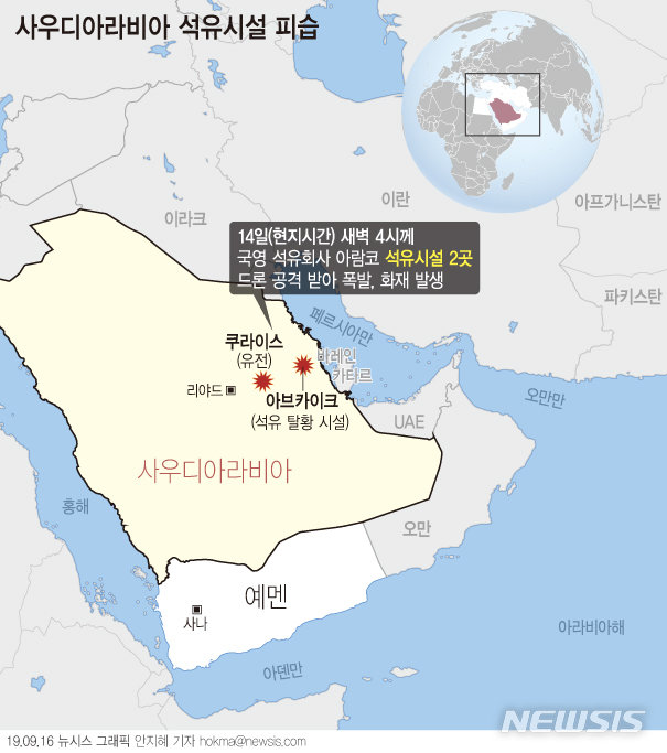 외신에 따르면 사우디아라비아의 국영 석유회사 아람코의 석유 생산 시설과 유전 등 2곳이 14일(현지시간) 친(親) 이란계 군사 세력 드론(무인기)의 공격을 받아 잠정 중단됐다. 이번 공격으로 사우디아라비아는 전체 산유량의 절반인 하루 평균 약 570만 배럴의 원유 생산이 지장을 받게 됐다. 이는 전 세계 원유 생산량의 5%에 해당하는 양이다.